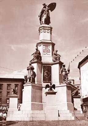 More than a century ago, this monument was erected to honor the state's sailors and soldiers who lost their lives in the battles of the Civil War. Located at the heart of Detroit's five main thoroughfares, this commemorative sculpture consists of eagles with raised wings at the base which seem to point towards four male figures representing the Navy, Calvary, Infantry and Artillery divisions of the U.S. Army. Above the males, four female figures, on pedestals, depict Victory, Emancipation, History and Union. At the top, the Indian warrior figure "Michigan" holds a sword in one hand and a shield in the other. Attending the dedication were Generals George Armstrong Custer, Philip H. Sheridan and Ambrose E. Burnside.